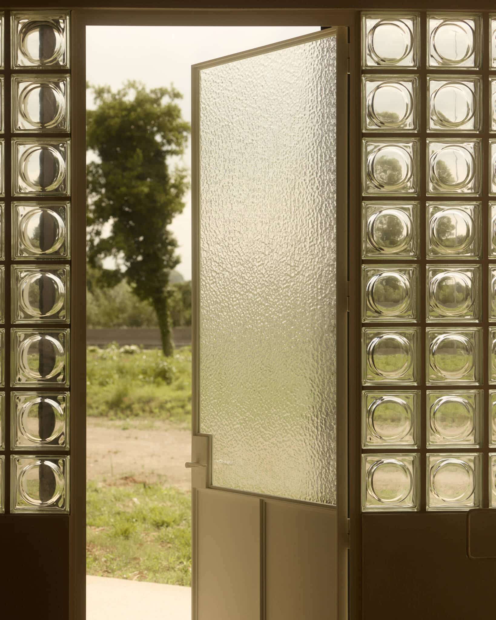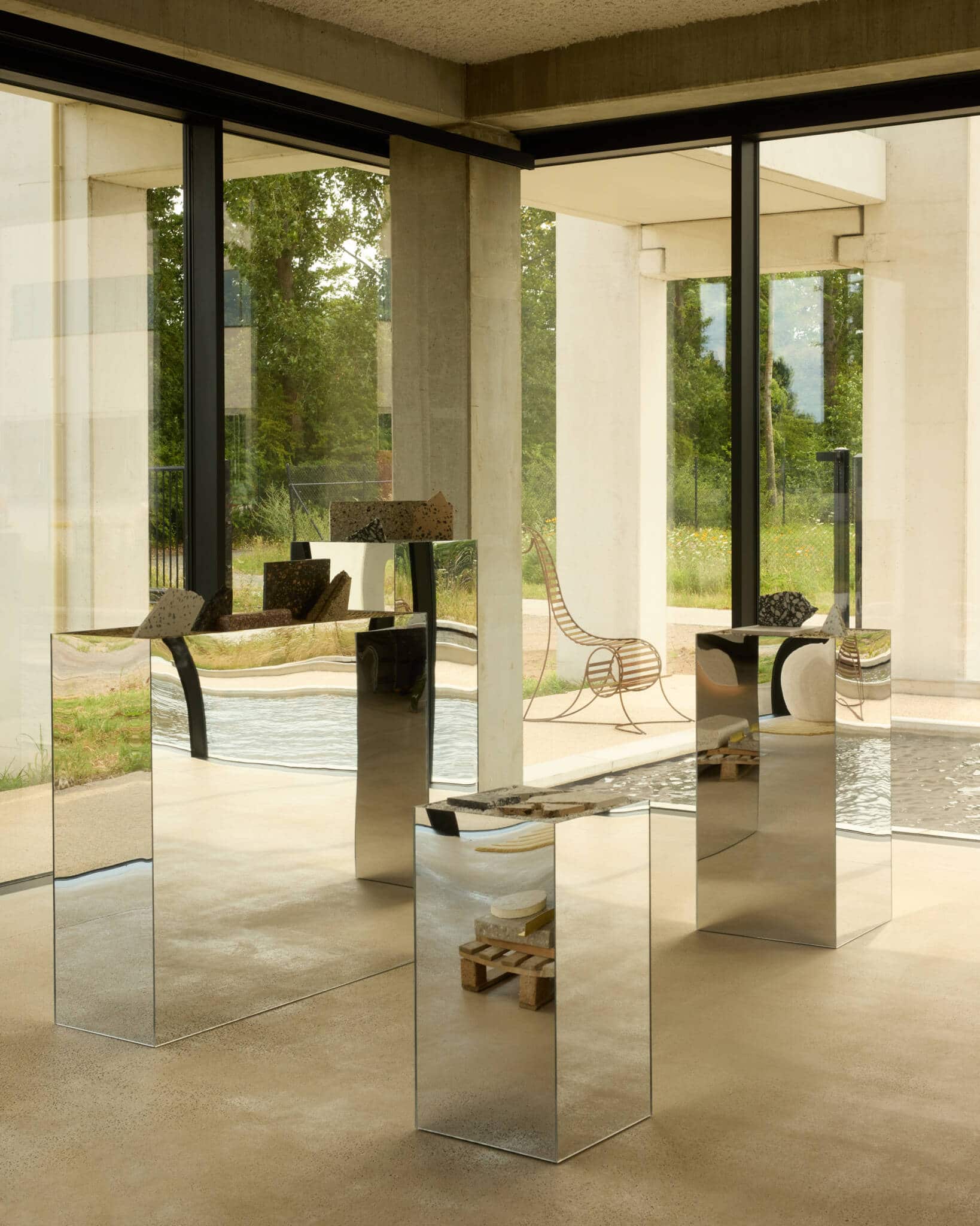 Outside, white concrete meets water in quiet dialogue. In the showroom, reflections dance across mirrored totems, where Nivolo's signature product samples are displayed like precious artefacts. A grand spiral staircase wrapped in exposed rebar anchors the entrance hall. The reception evokes a boutique hotel, complete with a lounge corner, two meeting rooms, and an in-house bistro. Here, tropical greenery mingles with a rippling glass-block wall. Capri tiles, a poured-concrete bench, velvet cushions, and warm wood tones come together in a modern composition.