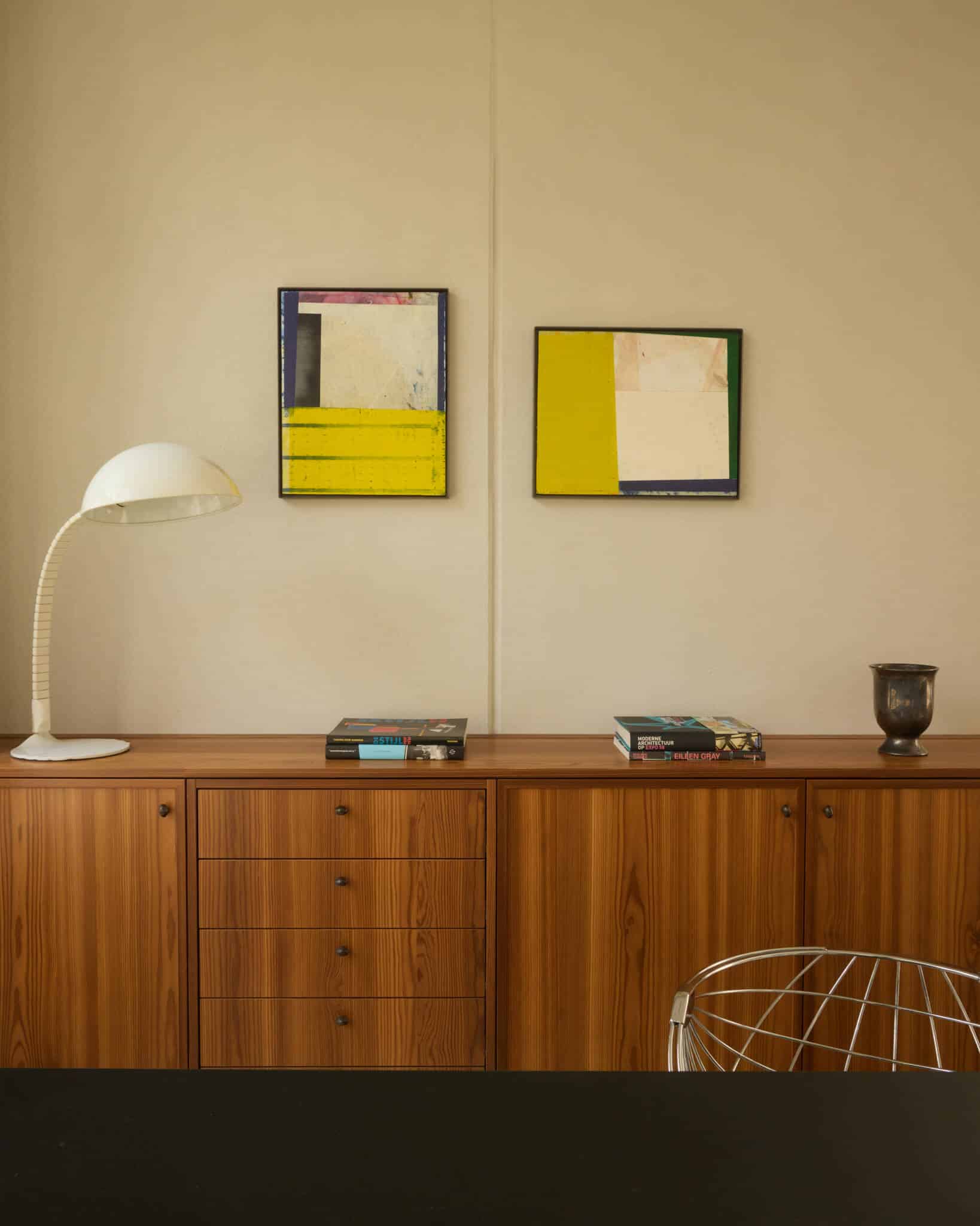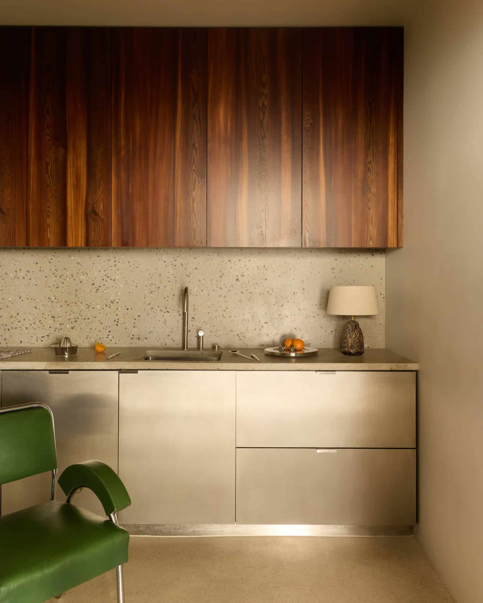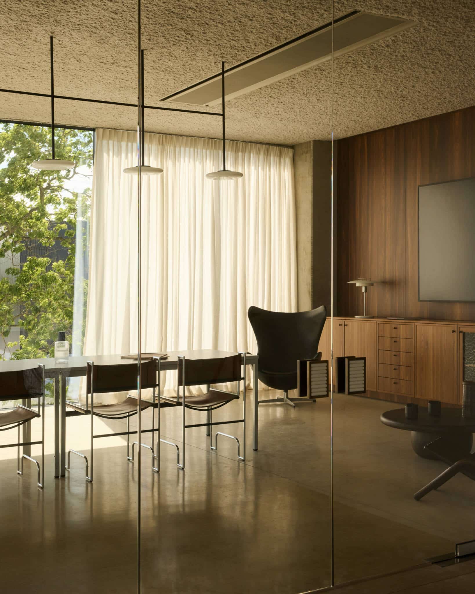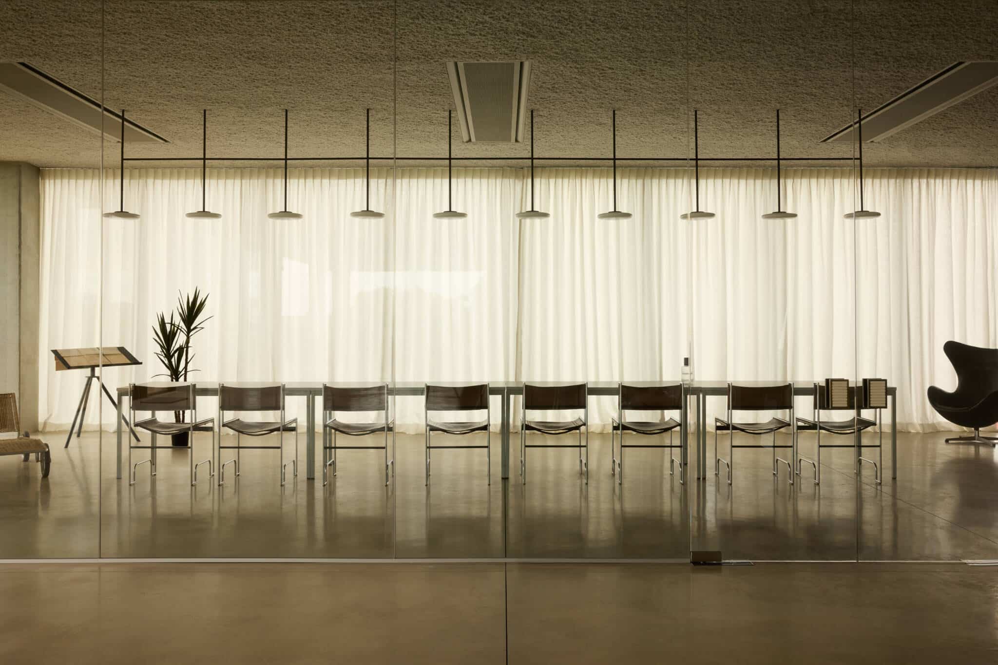 Upstairs, the open workspace features H2O desks by Claire Bataille for Bulo, an icon of Belgian design. Executive offices and a generous boardroom are grounded in pure materials, measured symmetry, and refined detail. Smoked larch wood flows throughout the interiors, from custom cabinetry to the wall cladding in silent zones. Bespoke elements, such as terrazzo washbasins in the restrooms, soft brass handles on cabinetry and doors, and a pale pink terrazzo-concrete table designed for architectural reviews, sit alongside carefully chosen vintage objects.